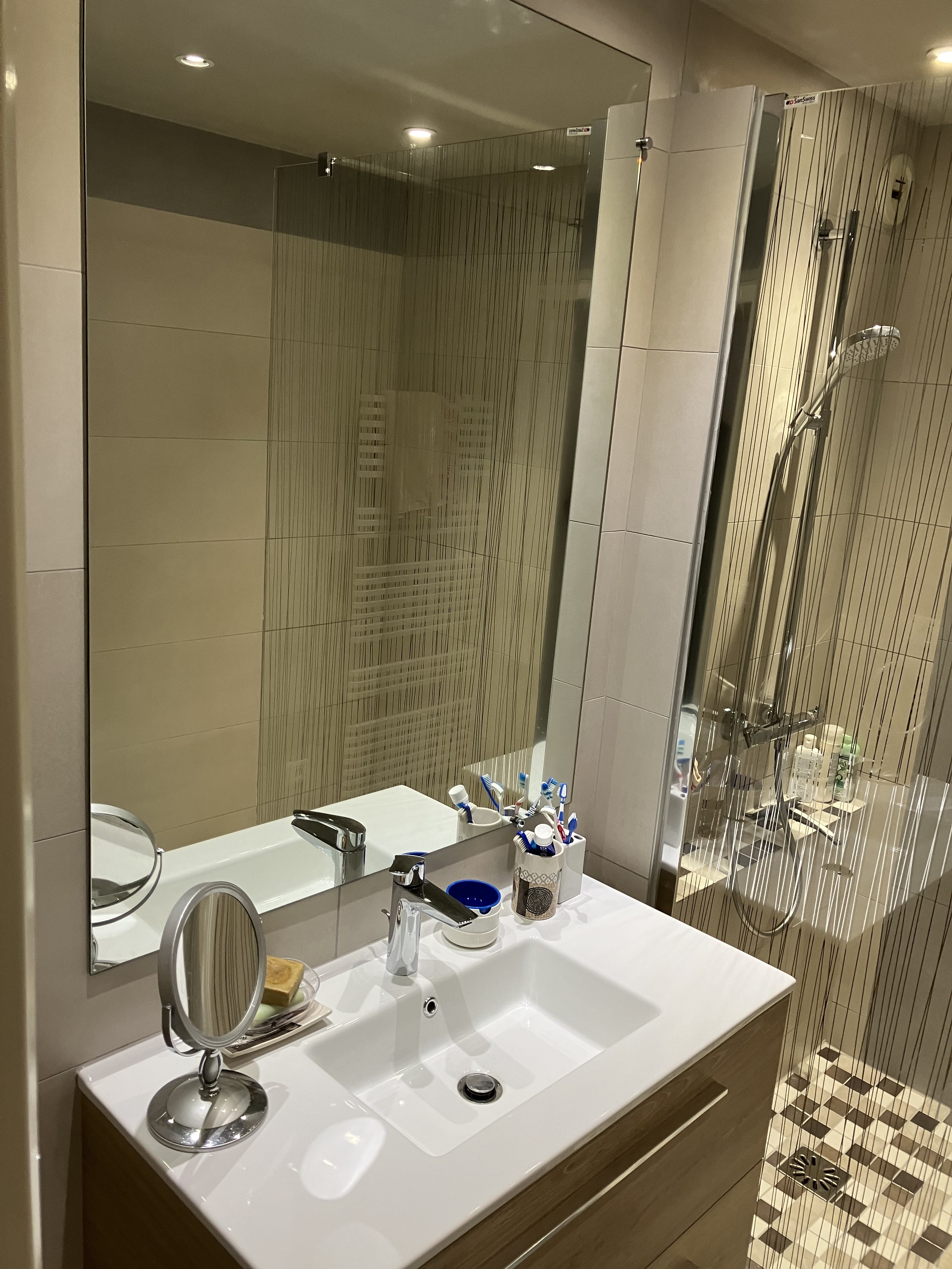Rénovation complète d'une vieille salle de bain par Valentin et Philippe Grange, avec remplacement d'une baignoire par une douche sur un receveur à carreler ouvert sur la pièce. Travail de très bonne qualité du début à la fin : conseils pour le démarrage et l'aide au choix des matériaux et mobilier, très bonne communication le long des travaux, conseils pour s'adapter au mieux aux contraintes de la pièce, très bonne réactivité, merci à vous !